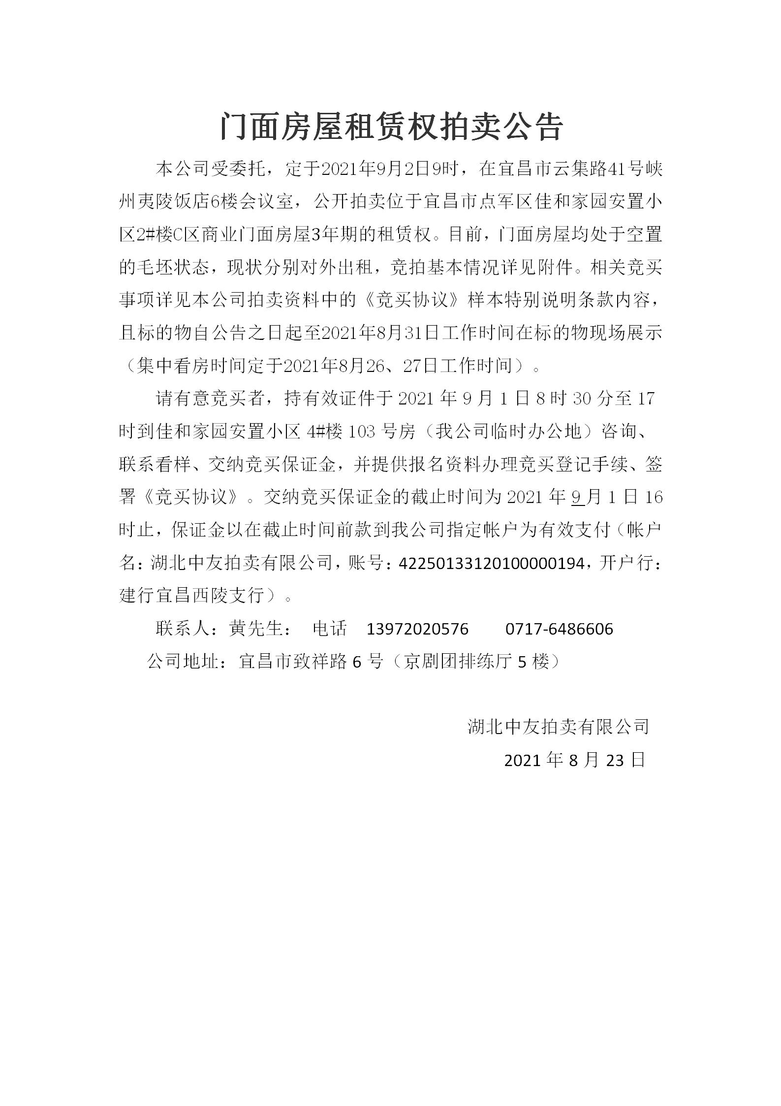 (通訊員周琴、彭曉燕)點(diǎn)軍區(qū)佳和家園安置小區(qū)2#樓C區(qū)商業(yè)門面房屋是點(diǎn)軍區(qū)國(guó)資局授權(quán)宜昌點(diǎn)盛投資開(kāi)發(fā)有限公司經(jīng)營(yíng)管理的安置房商業(yè)資產(chǎn),目前該項(xiàng)目正在開(kāi)展租賃權(quán)競(jìng)拍工作,競(jìng)拍公告已發(fā)布點(diǎn)軍區(qū)人民政府網(wǎng),現(xiàn)將公告內(nèi)容公布如下: