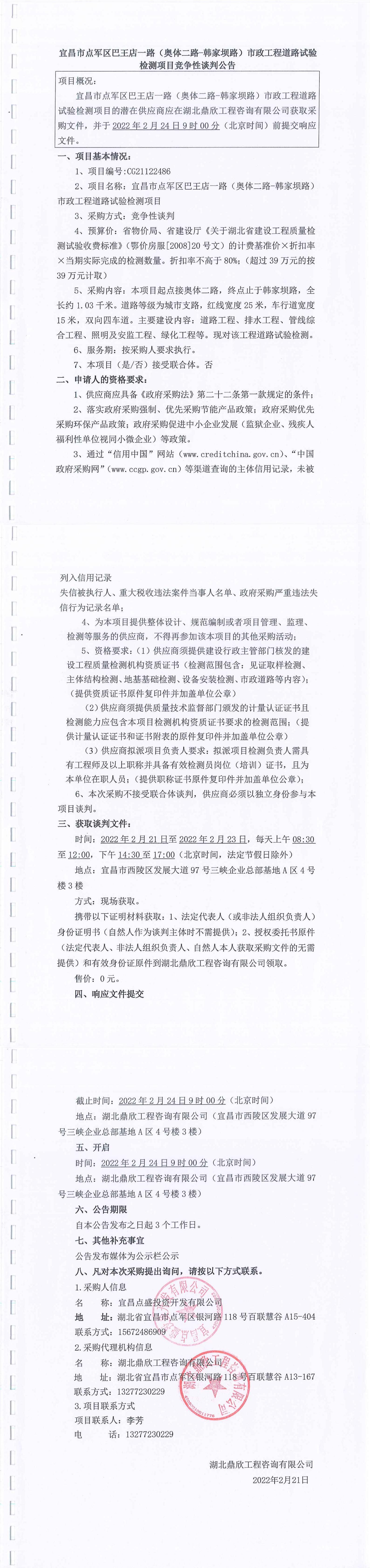 宜昌市點軍區(qū)巴王店一路(奧體二路-韓家壩路)市政工程道路試驗檢測項目談判公告
