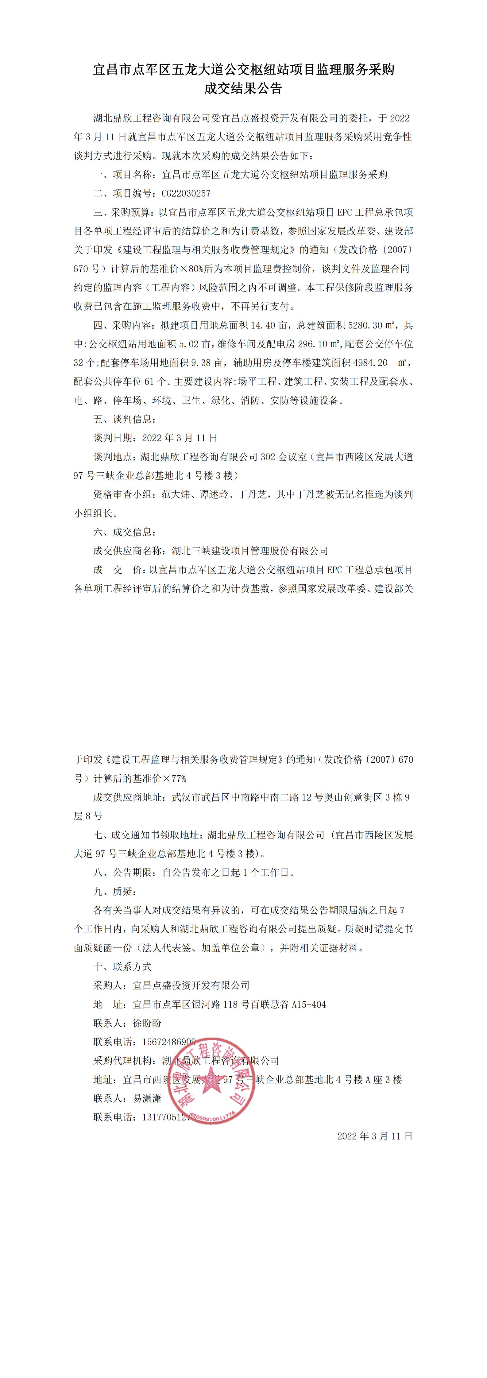 宜昌市點軍區(qū)五龍大道公交樞紐站項目監(jiān)理服務采購成交結(jié)果公告