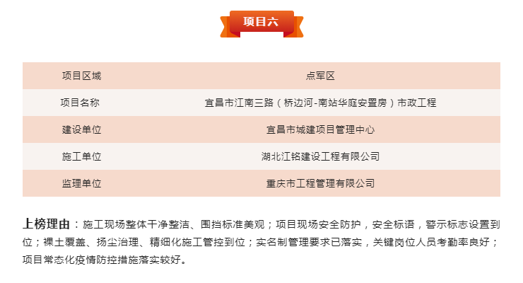 (通訊員:徐文剛、吳鵬翔)為進一步貫徹落實《宜昌市揚塵污染防治條例》《宜昌市城區(qū)建設工程文明施工管理紅黑榜制度(試行)》,強化建筑工地文明施工管理,壓實建設單位文明施工主體責任,鼓勵文明施工先進典型,打擊和曝光不文明施工違法行為,結合建筑工地實名制管理、關鍵崗位人員到崗履職相關要求,宜昌市住建局組織評選了2022年第七期建筑工程安全文明施工管理“紅黑榜”。點盛投資開發(fā)有限公司代建項目江南三路,成為點軍區(qū)唯一獲評紅榜的市政項目。