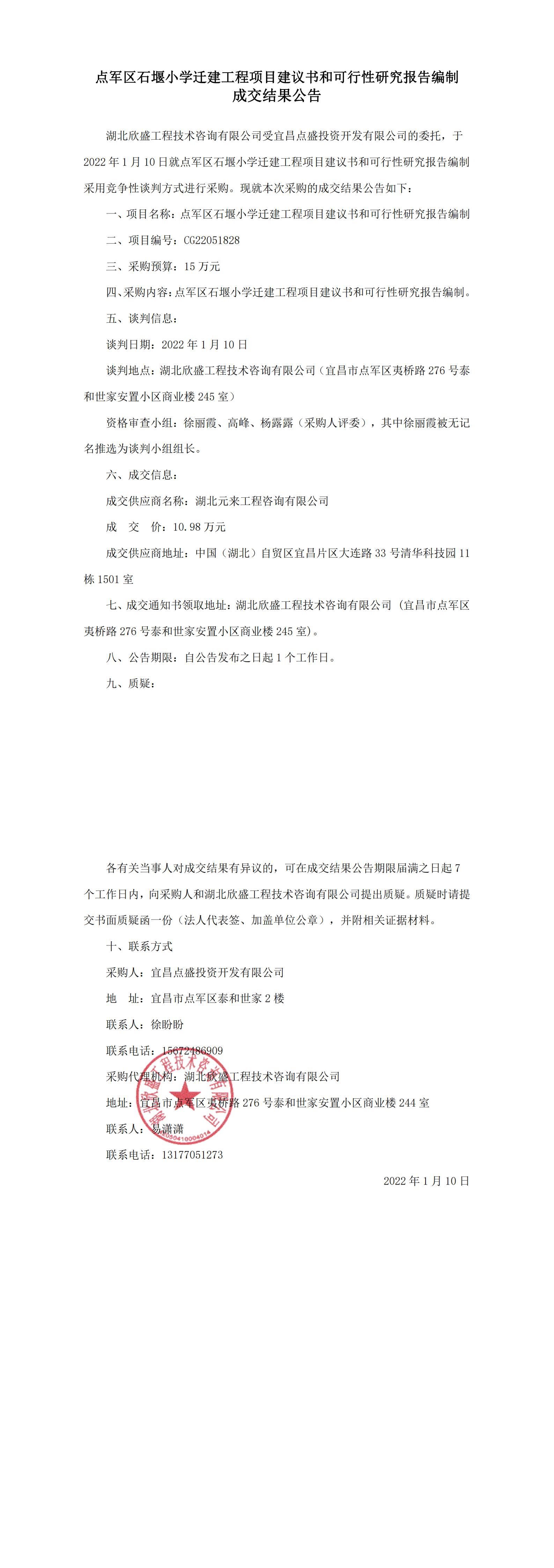 點軍區(qū)石堰小學(xué)遷建工程項目建議書和可行性研究報告編制成交結(jié)果公告