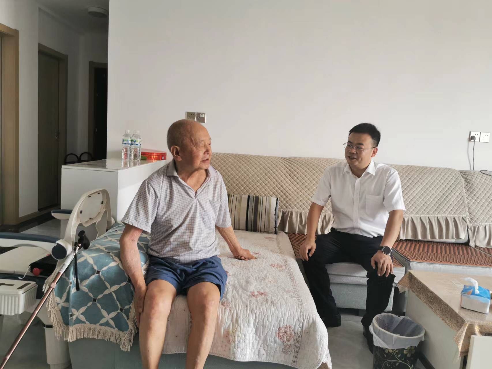 在老黨員劉世松家中,楊濤親切詢問了劉老的身體狀況和生活情況,得知劉老曾在橋邊村委會工作,現(xiàn)已85歲高齡,2018年患中風后,腿腳不便,致使出行困難,但仍積極參加橋邊村黨支部活動,為村集體經(jīng)濟建設和基層治理建言獻策。