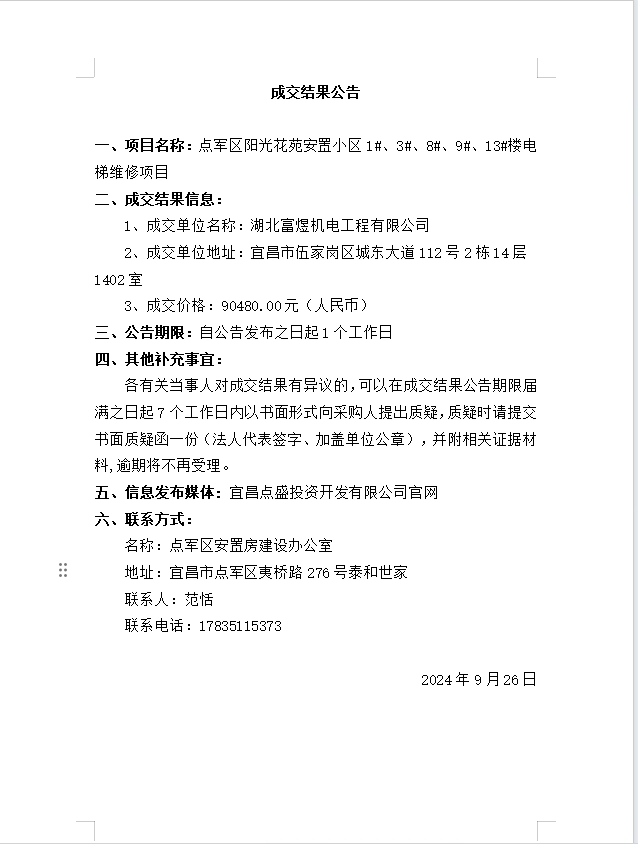 點(diǎn)軍區(qū)陽光花苑安置小區(qū)1#、3#、8#、9#、13#樓電梯維修項(xiàng)目成交公告