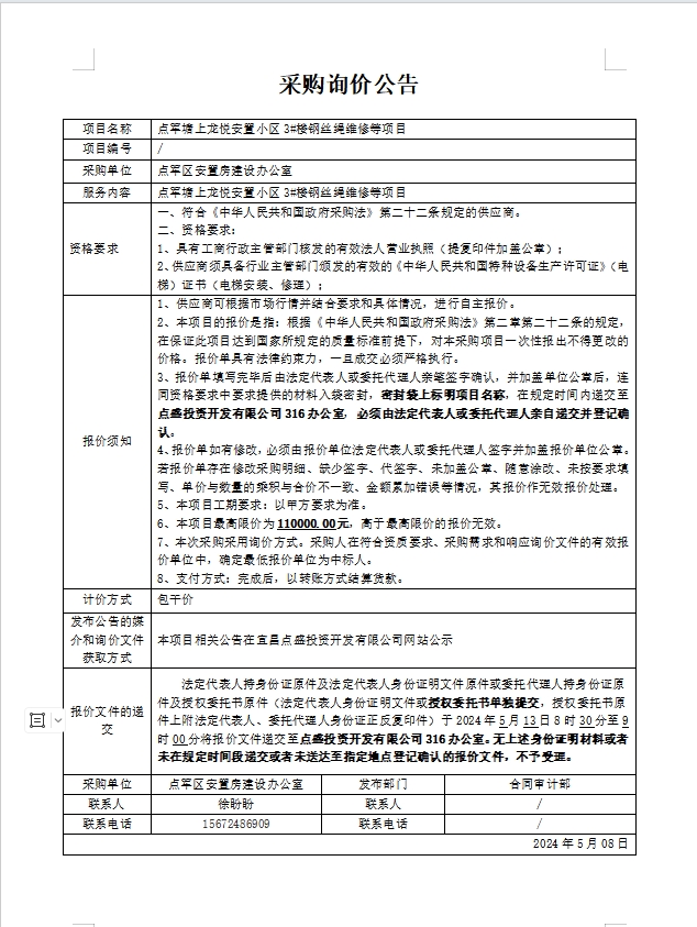 點軍塘上龍悅安置小區(qū)3#樓鋼絲繩維修等項目詢價公告