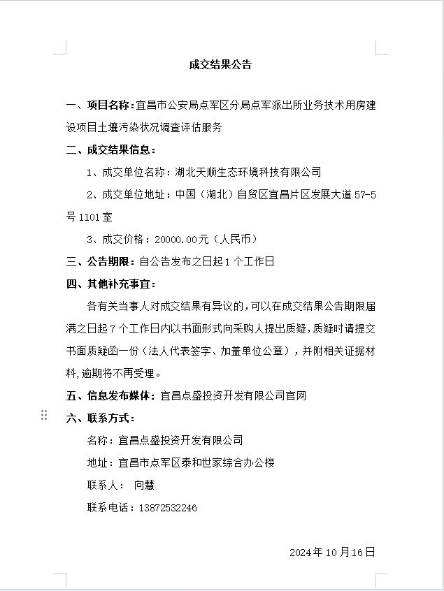 宜昌市公安局點軍區(qū)分局點軍派出所業(yè)務(wù)技術(shù)用房建設(shè)項目土壤污染狀況調(diào)查評估服務(wù)成交公告