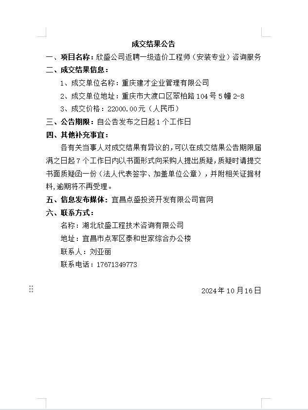 欣盛公司返聘一級(jí)造價(jià)工程師(安裝專(zhuān)業(yè))咨詢服務(wù)成交公告
