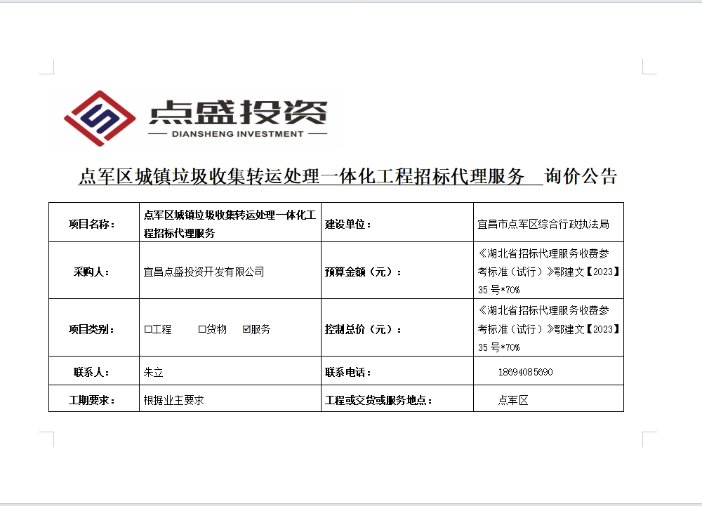 點(diǎn)軍區(qū)城鎮(zhèn)垃圾收集轉(zhuǎn)運(yùn)處理一體化工程招標(biāo)代理服務(wù)詢價公告