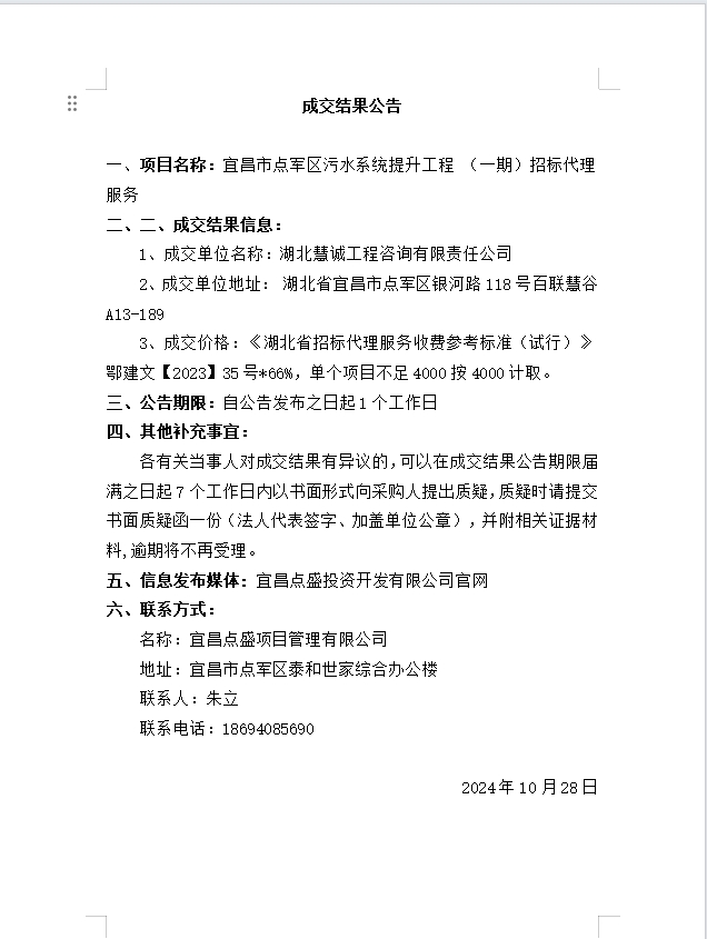 宜昌市點軍區(qū)污水系統(tǒng)提升工程 (一期)招標(biāo)代理服務(wù)成交公告