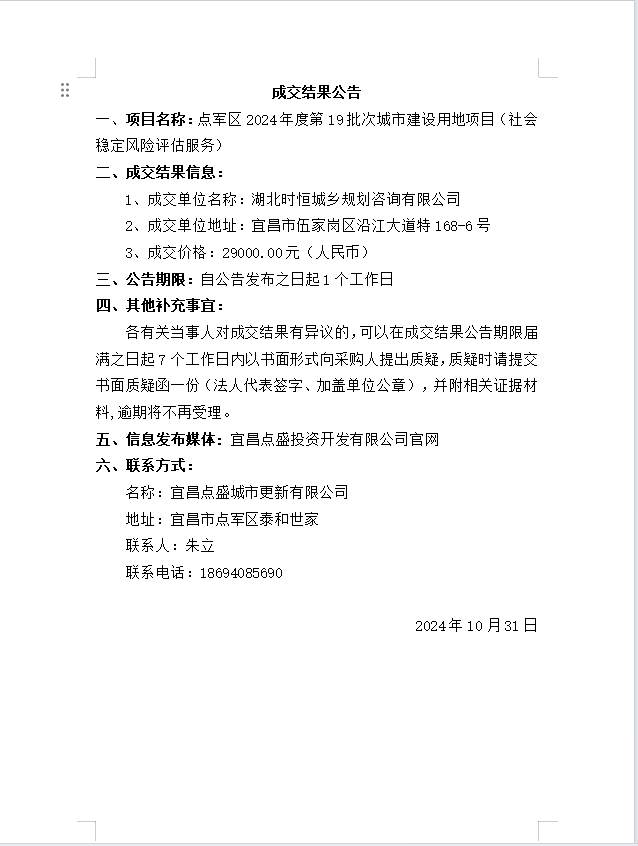 點(diǎn)軍區(qū)2024年度第19批次城市建設(shè)用地項(xiàng)目(社會(huì)穩(wěn)定風(fēng)險(xiǎn)評(píng)估服務(wù))成交公告