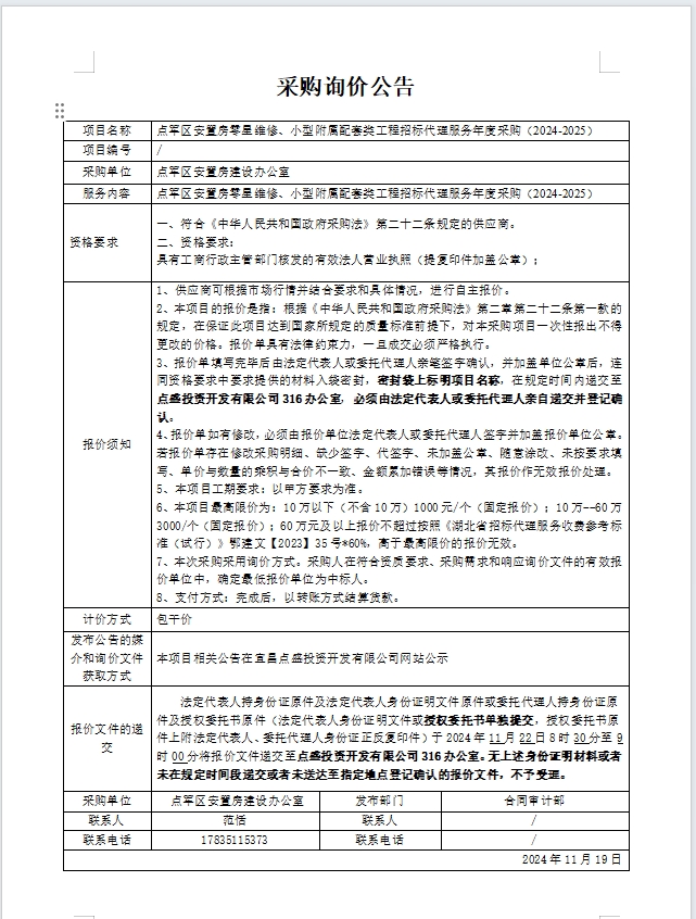 點軍區(qū)安置房零星維修、小型附屬配套類工程招標(biāo)代理服務(wù)年度采購(2024-2025)詢價公告