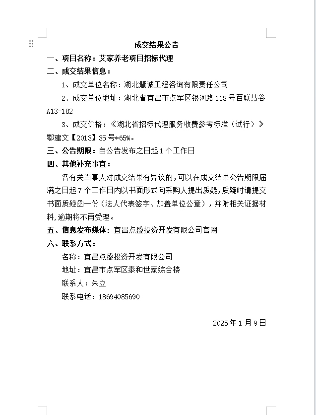 艾家養(yǎng)老項目招標代理成交公告