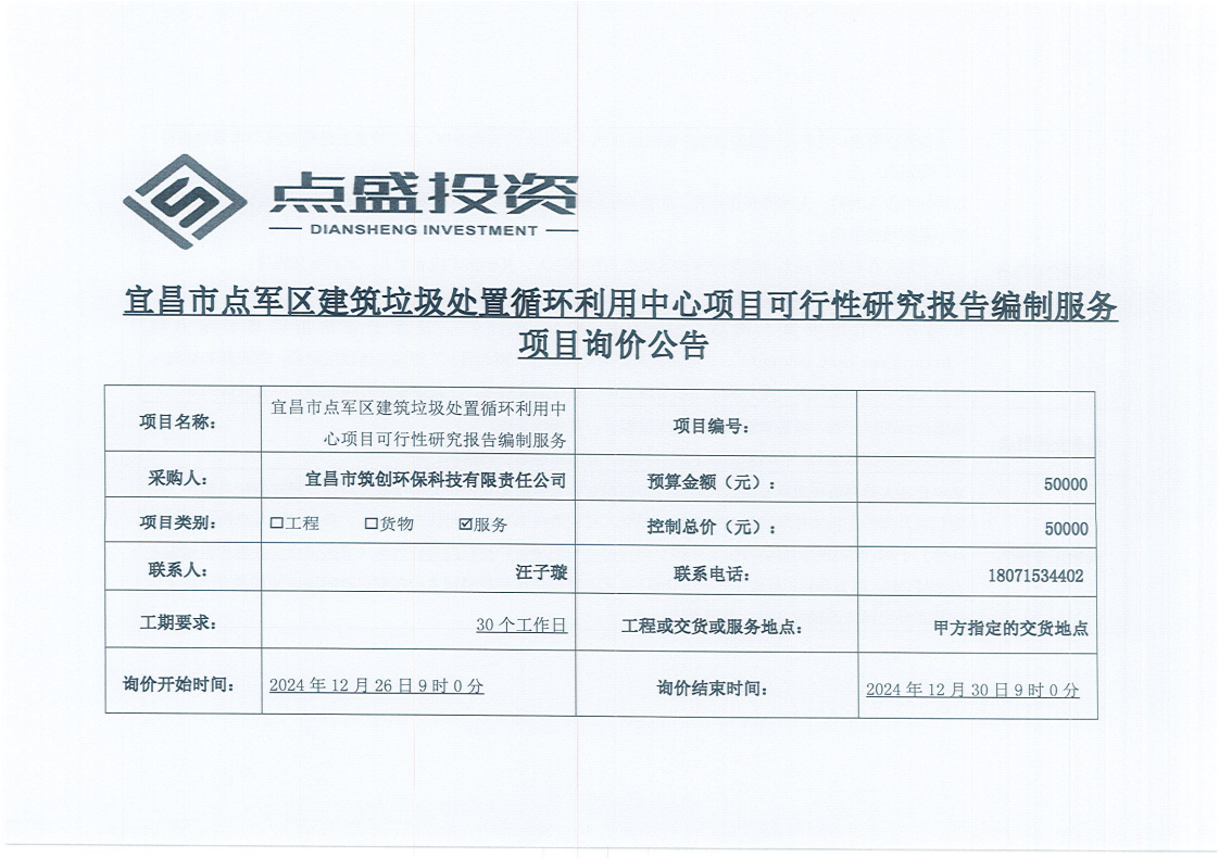 宜昌市點軍區(qū)建筑垃圾處置循環(huán)利用中心項目可行性研究報告編制服務項目詢價公告