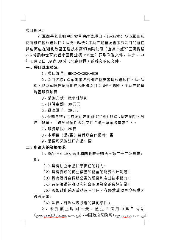 點(diǎn)軍湖景名苑棚戶(hù)區(qū)安置房改造項(xiàng)目(1#-8#樓)及點(diǎn)軍陽(yáng)光花苑棚戶(hù)區(qū)改造項(xiàng)目(1#樓-15#樓)不動(dòng)產(chǎn)地籍調(diào)查服務(wù)項(xiàng)目談判公告